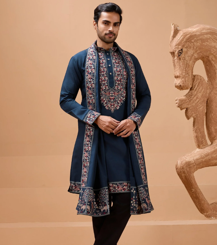 Kurta with dupatta for men is not just a trend anymore. It has become a strong style choice for many wedding functions. Earlier, dupattas were mostly linked with women’s outfits. Now designers are creating matching dupattas specially styled for men. The dupatta adds layers and movement to a simple kurta. It changes the whole vibe without adding heavy embroidery. Even a plain kurta looks richer when paired correctly. The key is balance, not overload.